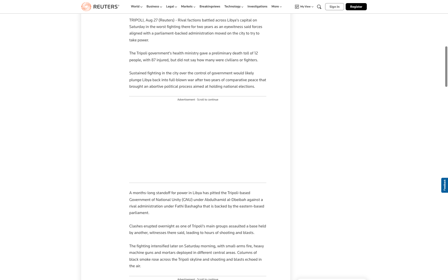 "Продолжительные бои в городе за контроль над правительством, скорее всего, снова ввергнут Ливию в полномасштабную войну после двух лет относительного мира, который привел к неудачному политическому процессу, направленному на проведение национальных выборов", — пишет Reuters.