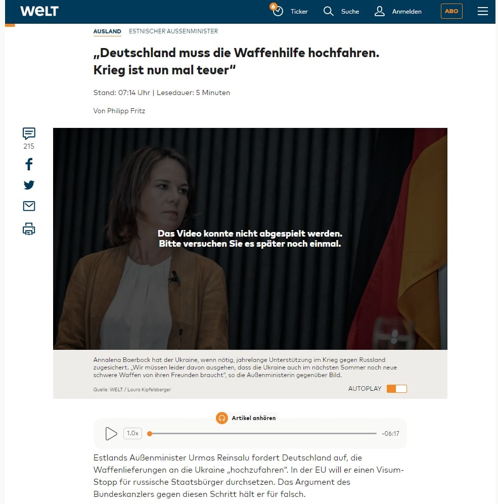 10:03 Страны Балтии направили Еврокомиссии свои предложения по 8-му пакету санкций против России. Они касаются мер в отношении торговли, энергетики, а также новые ограничения по SWIFT, сообщил глава МИД Эстонии Урмас Рейнсалу в беседе с немецкой газетой Die Welt.