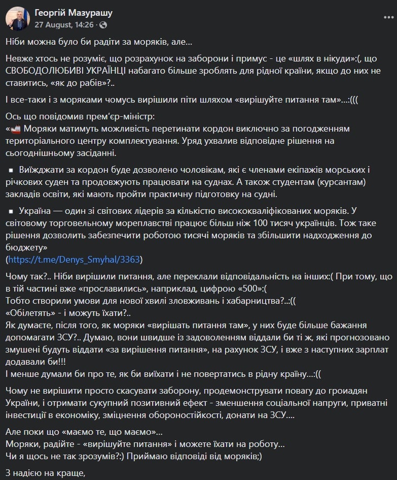 10:50 Нардеп Георгий Мазурашу раскритиковал в Facebook решение правительства разрешить выезд за границу морякам по согласованию военкоматов.