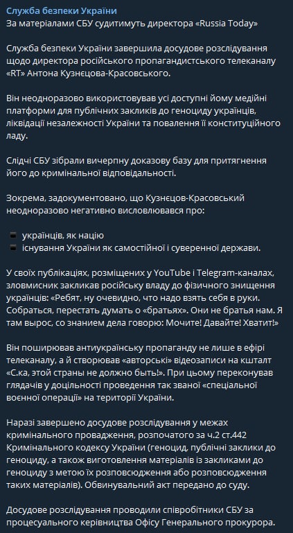 "Он неоднократно использовал все доступные ему медийные платформы для публичных призывов к геноциду украинцев, ликвидации независимости Украины и свержению ее конституционного строя", - говорят в СБУ.