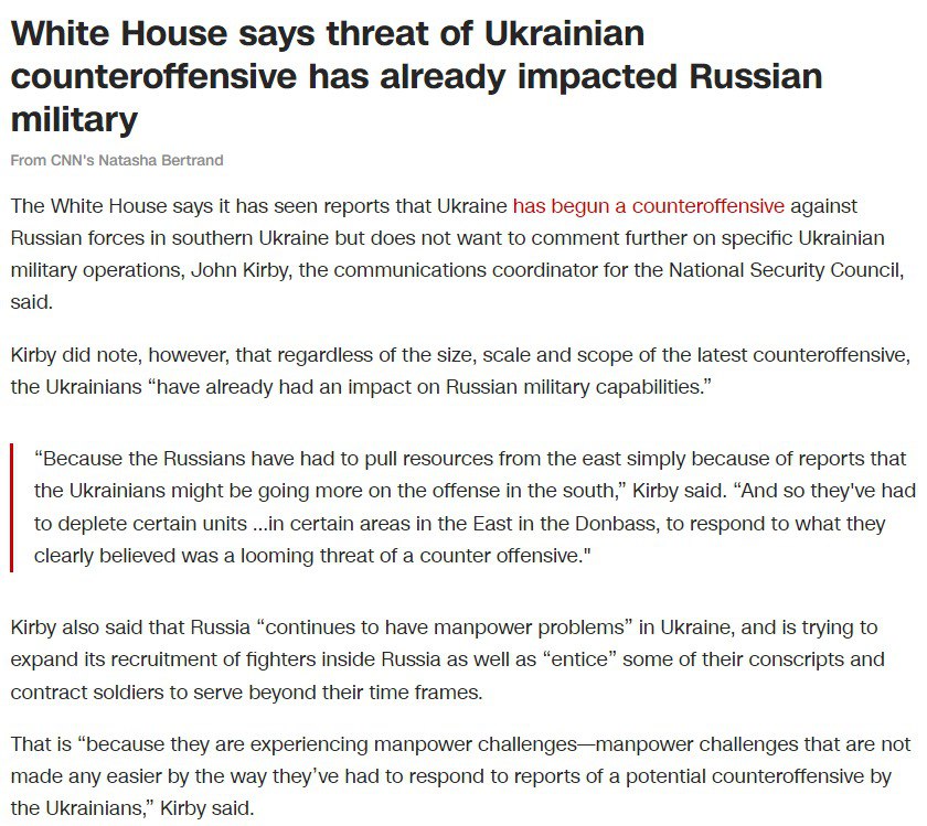 Кирби, однако, отметил, что, независимо от размера, масштаба и размаха последнего контрнаступления украинцы уже оказали влияние на военный потенциал России.