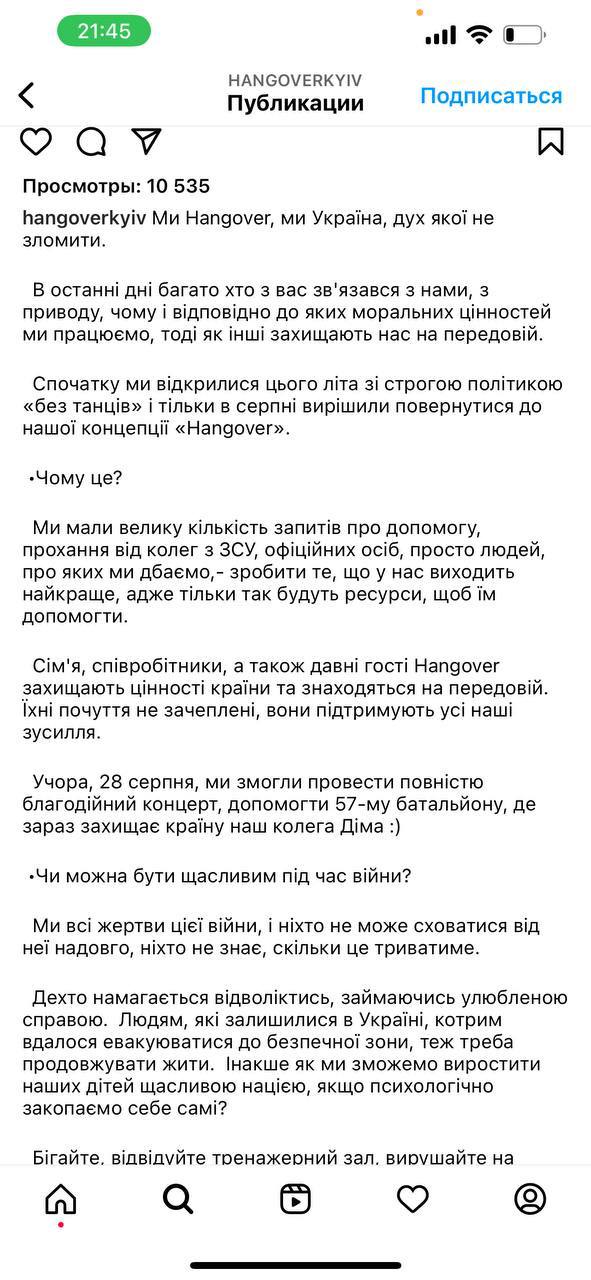 21.55 Уже есть реакция ресторана Hangover на видео, на котором возмущаются тусовкой около заведения во время войны.