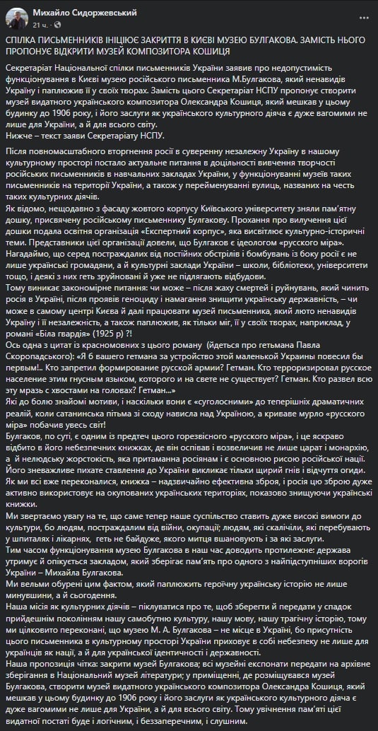 Причина - Булгаков "ненавидел Украину и порочил ее в своих произведениях", пишет глава организации Михаил Сидоржевский.