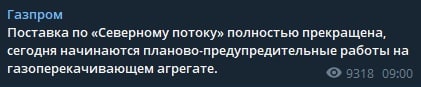 "Поставка по "Северному потоку" полностью прекращена, сегодня начинаются планово-предупредительные работы на газоперекачивающем агрегате", - говорится в сообщении.
