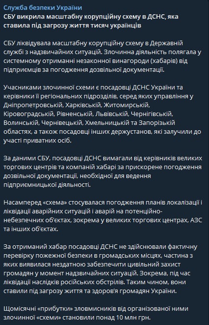 Руководство ГСЧС в ряде областей требовало от руководителей больших торговых центров и компаний взятки за выдачу документации для предпринимательской деятельности.