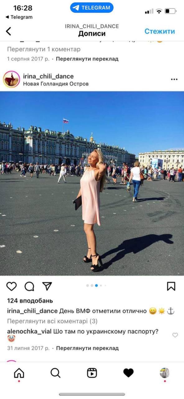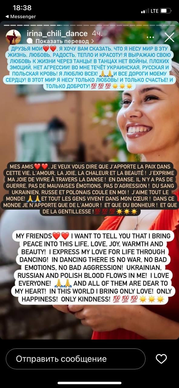 На своей странице в Инстаграм Ирина Владимирова (видимо, после шквала возмущений от украинцев) прокомментировала свое участие в "Танцах со звёздами", заявив, что она "за мир", и в ней течёт как русская, так и украинская кровь, а ещё польская.
