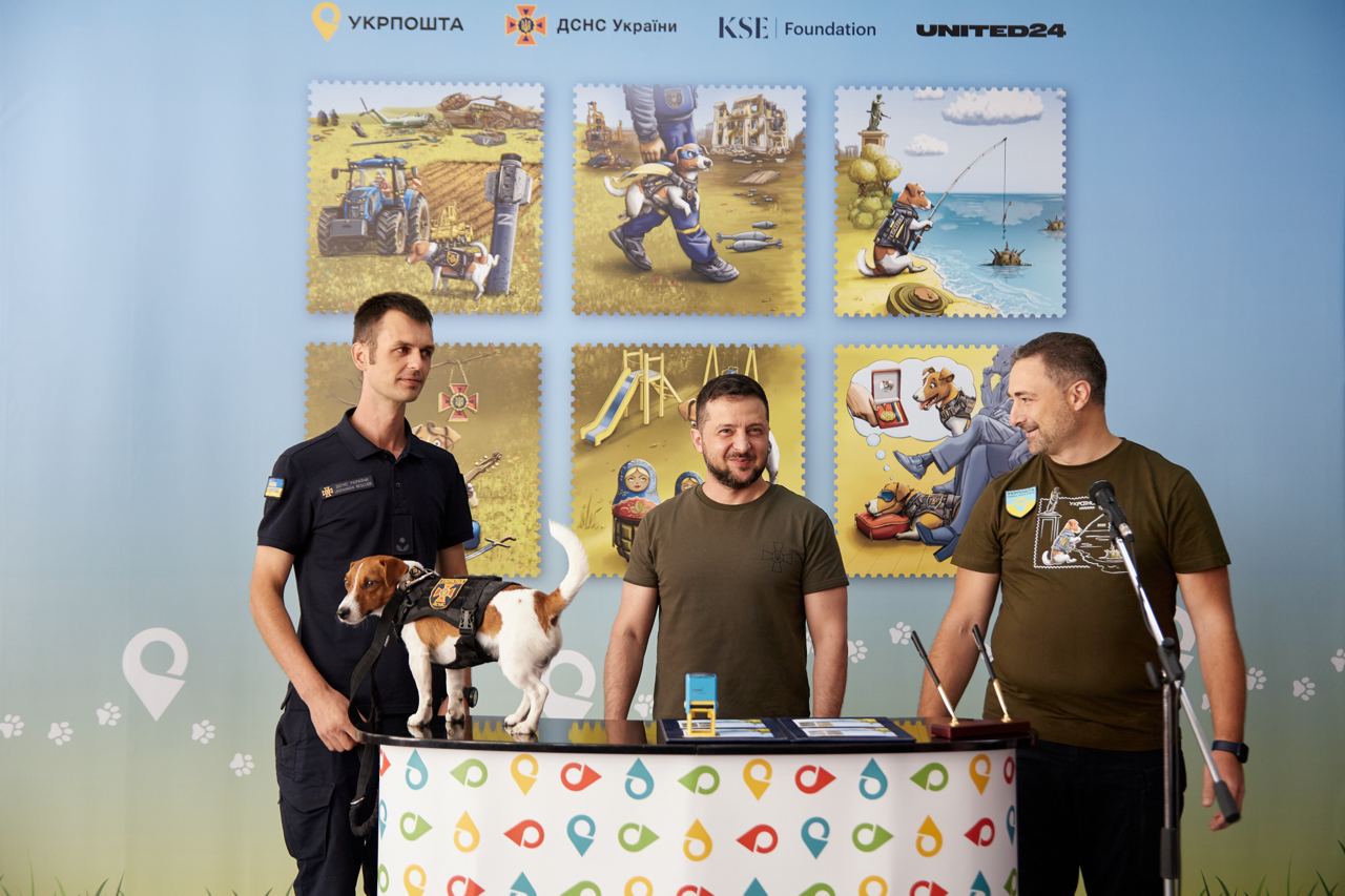 "Укрпочта" запустила в продажу новую почтовую марку "Пес Патрон". На ее торжественном представлении в Ирпенской школе присутствовали президент Владимир Зеленский и сам четырехлапый сотрудник ГосЧС.