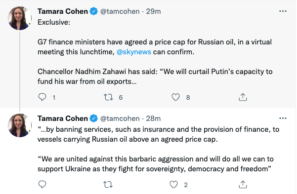 "Мы ограничим возможности Путина финансировать свою войну за счет экспорта нефти, запретив такие услуги, как страхование и предоставление финансов судам, перевозящим российскую нефть по цене выше согласованного предела", - заявил министр финансов Великобритании Надхим Захави, пишет репортер Sky News Тамара Коэн.