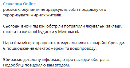"Сегодня ночью под обстрелы попали лечебные учреждения, школы и жилые дома в Николаеве" - сообщил он.