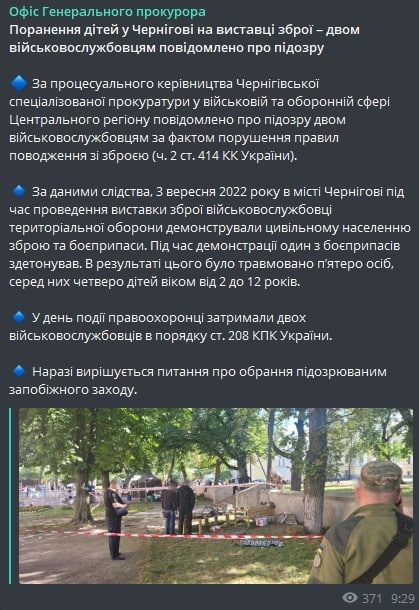 По данным следствия, 3 сентября 2022 года в Чернигове во время проведения выставки оружия военнослужащие территориальной обороны демонстрировали гражданскому населению оружие и боеприпасы. Во время демонстрации один из боеприпасов сдетонировал. В результате этого были травмированы пять человек, среди них четверо детей в возрасте от 2 до 12 лет.
