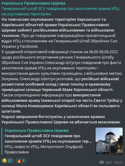 Украинская православная церковь пишет про захват храмов УПЦ на оккупированных территориях, со ссылкой на информацию Генштаба ВСУ.