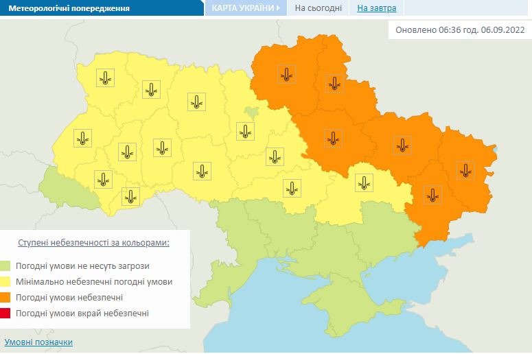 Ночью 7-8 сентября в Украине, кроме Закарпатья и южной части, обещают заморозки на поверхности почвы 0...-5 (I уровень опасности, желтый), в северо-восточных и восточных областях и в воздухе 0...-3 (II уровень опасности, оранжевый).