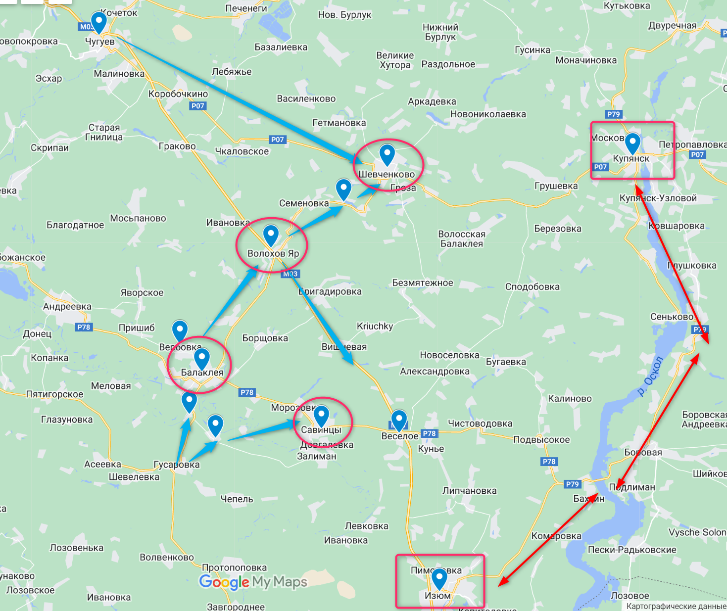 И ВСУ наступают на Купянск, обойдя Балаклею с севера. Через деревни Вербовку, Яковлево и Волохов Яр украинские силы направляются в сторону Шевченково, которое находится примерно в 30 километрах от Купянска по прямой.