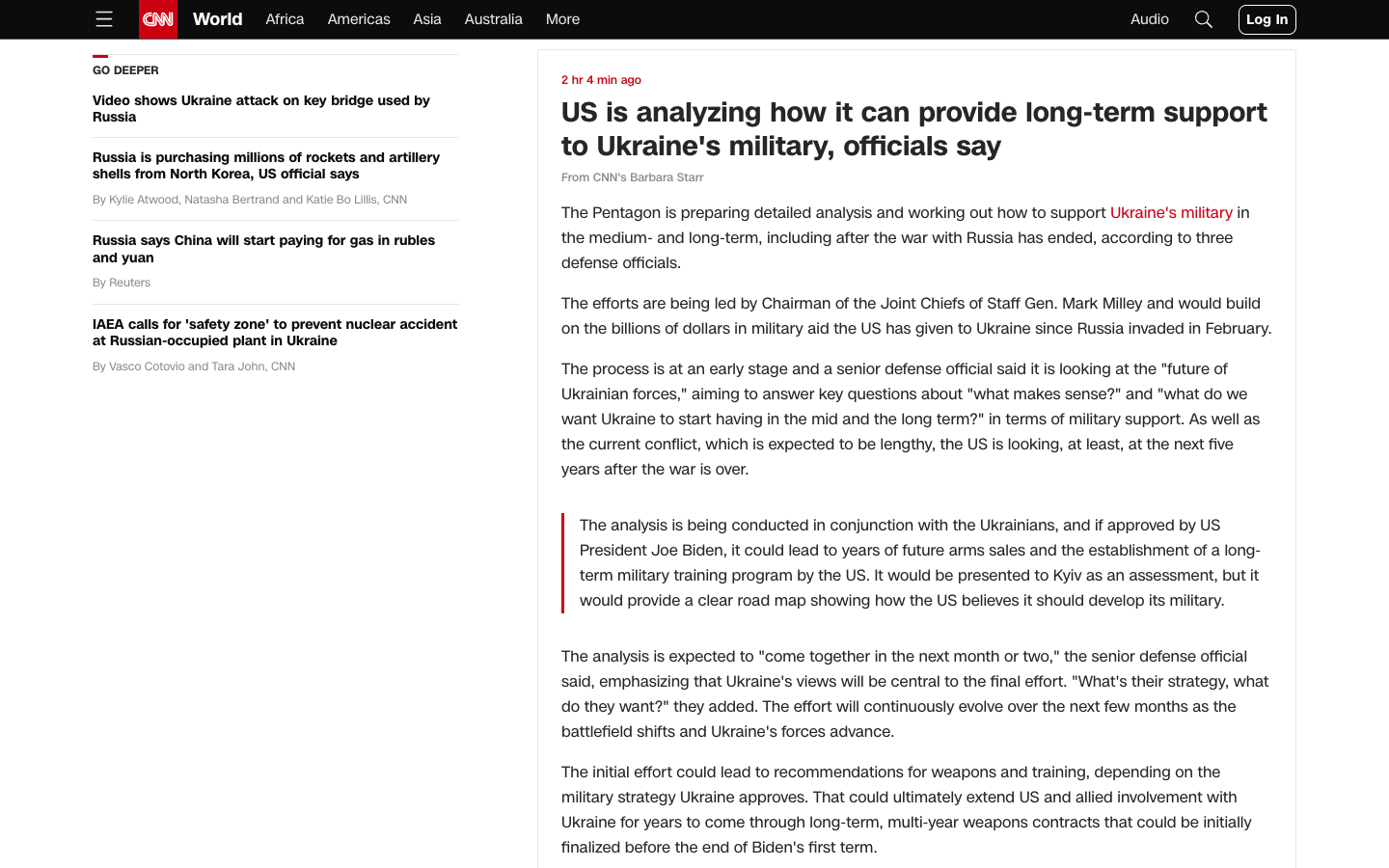 Американские чиновники говорят, что пока процесс находится на ранней стадии, в рамках которого американцы анализируют, какая военная помощь понадобится ВСУ в среднесрочной и долгосрочной перспективе, вплоть до пяти лет после окончания войны.