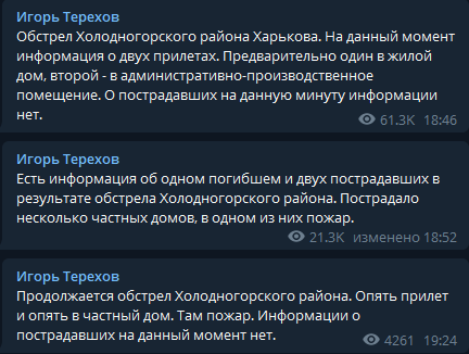 Позже мэр добавил, что по состоянию на 19.24 обстрел Холодногорского района. еще продолжался. Зафиксирован прилет в частный дом, на месте вспыхнул пожар.