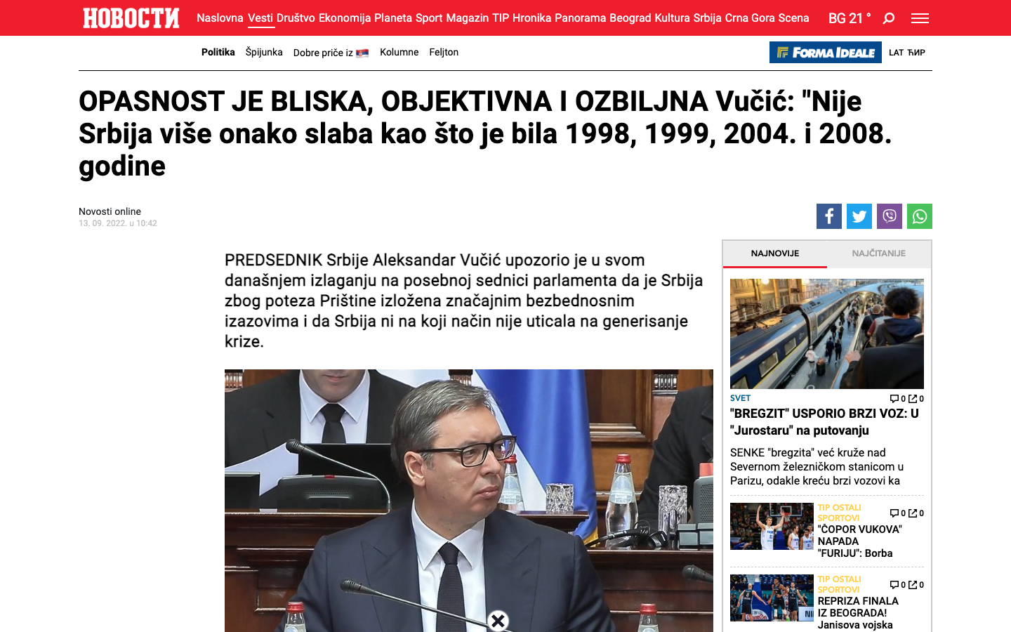 "Мы живем в тот момент, когда Сербия сталкивается с серьезными проблемами безопасности из-за действий Приштины. Мне кажется, вы можете понять и почувствовать это сами. Я хочу вам сказать, что у нас увеличивается присутствие сил специального назначения Приштинской полиции на севере Косово", - заявил Вучич,  представляя "Отчет о переговорном процессе с временными органами самоуправления в Приштине" с 15 июня 2021 года по 1 сентября 2022 года.