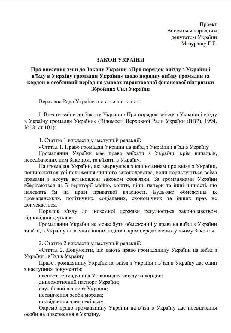 Депутат от "Слуги народа" Георгий Мазурашу зарегистрировал в парламенте законопроект о возможности выезда мужчин за границу в военное время при условии оплаты гарантийного взноса.