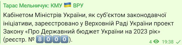 Кабинет Министров Украины зарегистрировал в Верховной Раде проект госбюджета-2023 под номером 8000.