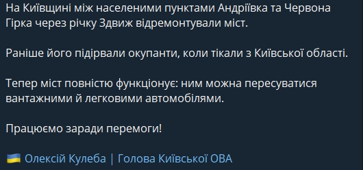 В Киевской области между Андреевкой и Красной Горкой отремонтировали мост через реку Здвиж, взорванный во время боевых действий.