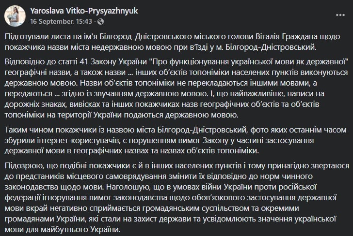 Витко-Присяжнюк напомнила, что согласно статье 41 Закона Украины "О функционировании украинского языка как государственного" географические названия, а также названия других объектов топонимики населенных пунктов выполняются на государственном языке. Названия объектов топонимики не переводятся на другие языки, а передаются согласно звучанию на украинском.