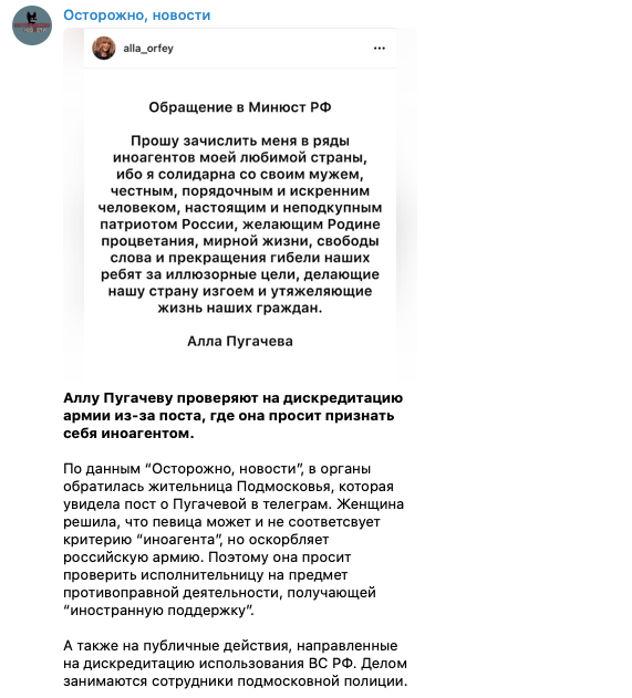 По данным телеграм-канала Ксении Собчак "Осторожно, Новости", в правоохранительные органы РФ обратилась жительница Подмосковья, которая увидела пост о Пугачевой в телеграме и решила, что певица может и не соответсвует критерию "иноагента", но оскорбляет российскую армию.