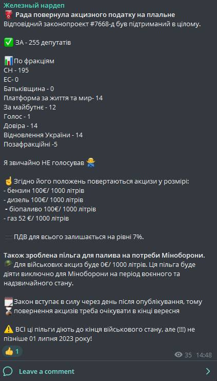 Верховная Рада вернула акциз на топливо. За проголосовали 255 нардепов. Об этом сообщил депутат Ярослав Железняк.