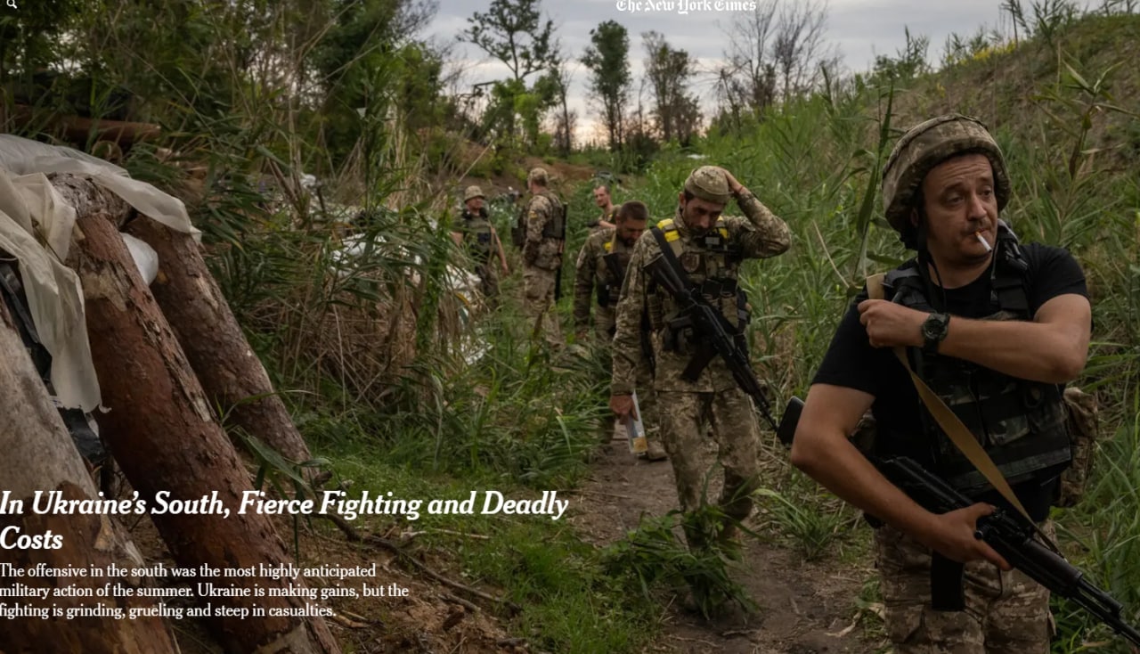 Нынешняя битва за юг Украины - самая страшная за всю войну. Данные о потерях украинской стороной не разглашаются, но после бесед с бойцами ВСУ американский корреспондент вынес ощущение, что потери "большие и даже массовые".