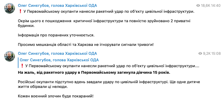 В Первомайском Харьковской области в результате сегодняшнего обстрела погибла 15-летняя девушка.
