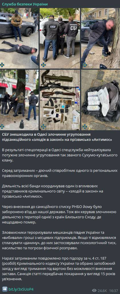 СБУ сообщает, что обезвредила в Одессе преступную группировку так называемого Сухумо-Кутаисского клана, которой руководил подсанкционный "вор в законе" "Антимос", который недавно умер.