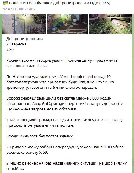 07.48 В Днепропетровской области ночью по Никополю ударили трижды. В городе повреждены более 10 многоэтажных и частных домов, лицей, остановка транспорта, газопровода и 6 линий электропередач.