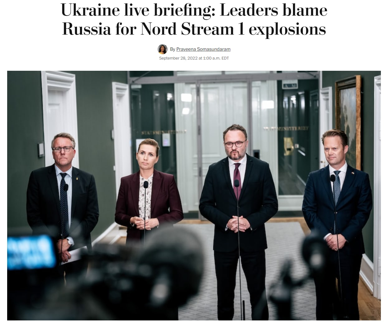 Американская газета The Washington Post вышла с заголовком "Лидеры обвиняют Россию во взрывах на "Северном потоке-1". При этом ни один из изображенных на фото политических лидеров не обвинял Москву в диверсии.