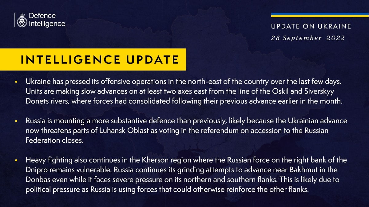 Британская разведка сообщает, что Россия создает более сильную оборону, чем раньше - вероятно, потому, что украинское наступление теперь угрожает частям Луганской области, где завершается "референдум" по присоединению к РФ.