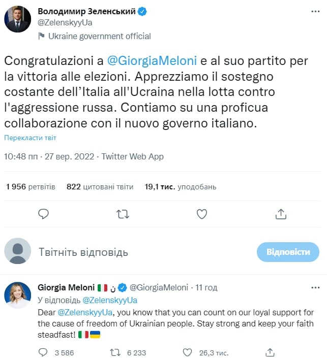 11.50 Лидер правой партии "Братья Италии" Джорджия Мелони после победы на выборах пообещала поддержку Украине.