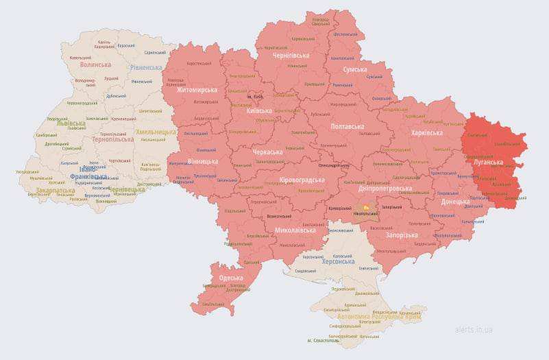 20:43 Сообщают о взрывах в Кривом Роге и пригородах Днепра. Карта воздушных тревог на сейчас выглядит так.