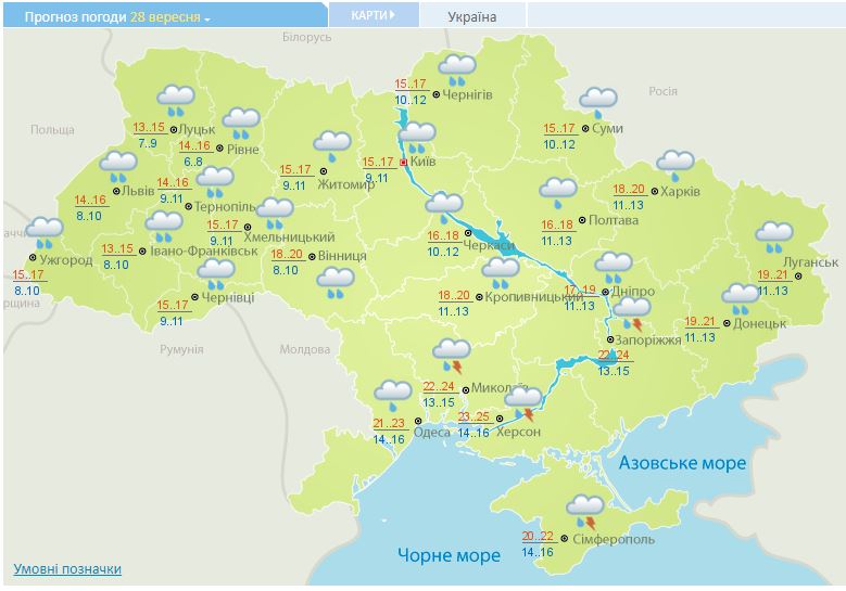 06.25 В Украине сегодня дожди. Теплее всего в Николаеве и Херсоне - до +24...+25. Прохладнее всего в Ивано-Франковске - до +13...+15 днем.