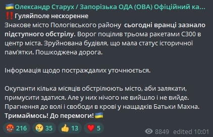 "Знаковый город Пологовского района сегодня утром подвергся коварному обстрелу. Враг попал тремя ракетами С-300 в центр города. Разрушено здание, имевшее статус исторического памятника. Повреждена дорога", - написал глава Запорожской ОГА Александр Старух.