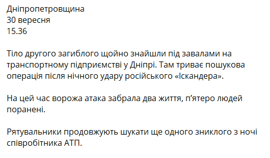 Сегодня, 30 сентября, спасатели обнаружили тело второго погибшего под завалами на транспортном предприятии в Днепре. Там идет поисковая операция после ночного удара российского комплекса "Искандер". Об этом сообщил глава Днепропетровской ОВА Валентин Резниченко в своем телеграм-канале.