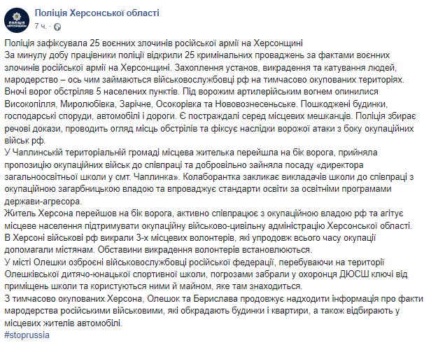 В целом за минувшие сутки сотрудники полиции открыли 25 уголовных производств по фактам военных преступлений российской армии в Херсонской области.
