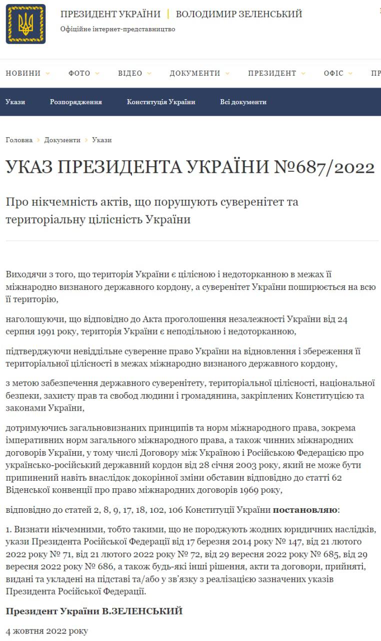 Президент Украины Владимир Зеленский указом №687 от 4 октября признал ничтожными указы Владимира Путина о т.н "независимости" Крыма, Луганской, Донецкой, Херсонской и Запорожской областей и любые решения их на основании.