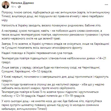 Синоптик Наталья Диденко пишет, что в Украину заходит антициклон.