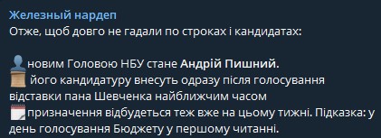 "Итак, чтобы долго не гадали по срокам и кандидатам: новым главой НБУ станет Андрей Пышный (бывший руководитель Ощадбанка - Ред.)", - написал он.