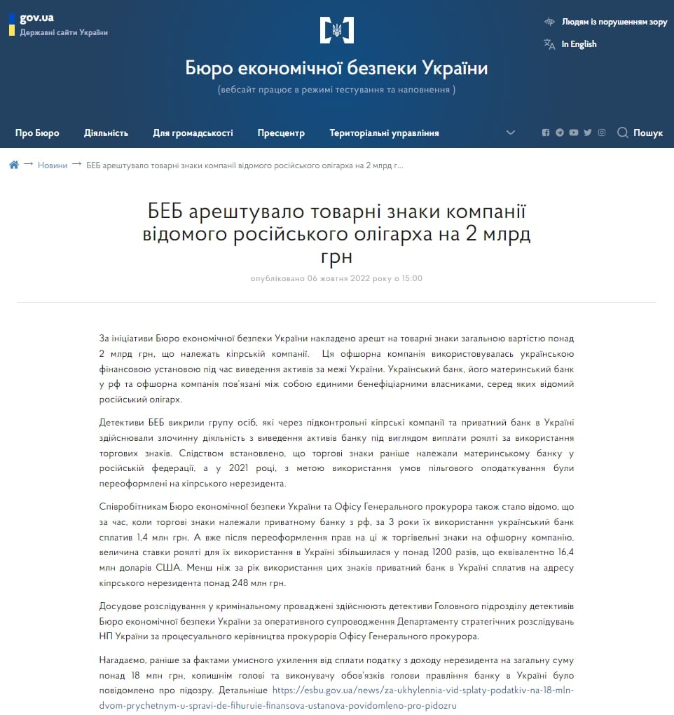 Бюро экономической безопасности заявило об аресте товарных знаков компании известного российского олигарха стоимостью 2 млрд грн.