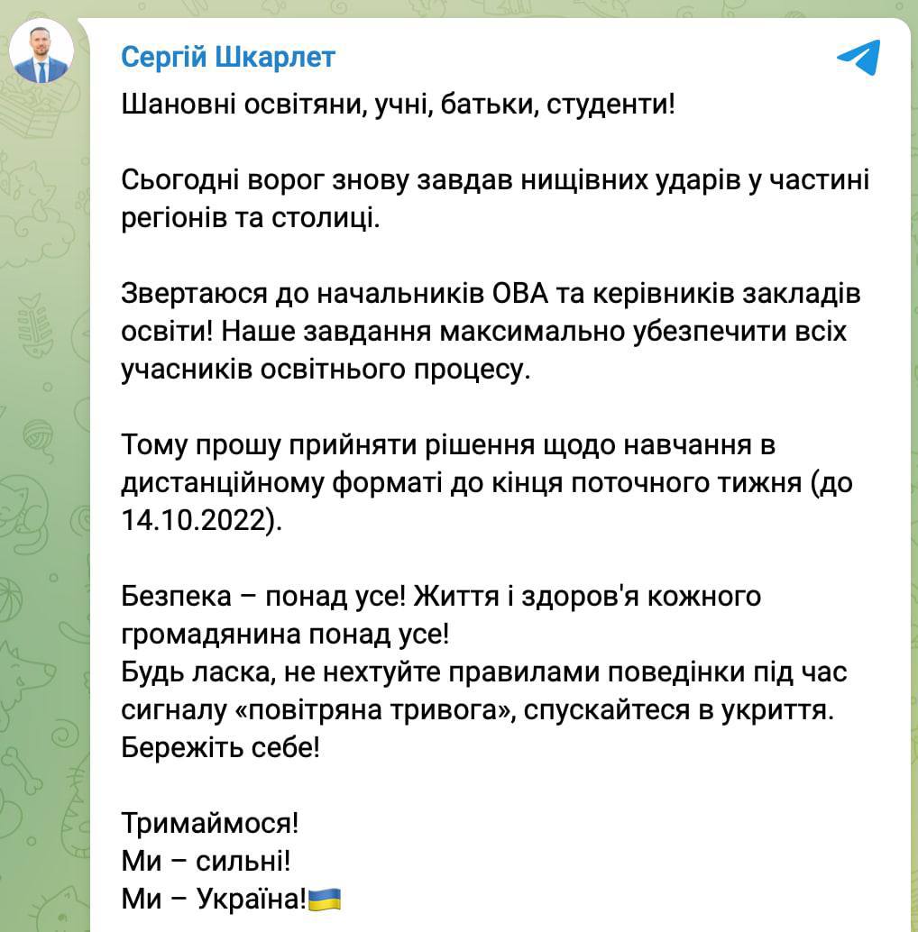 После массированного ракетного удара РФ до конца недели (до 14 октября) все школы Украины переводятся на дистанционное обучение.
