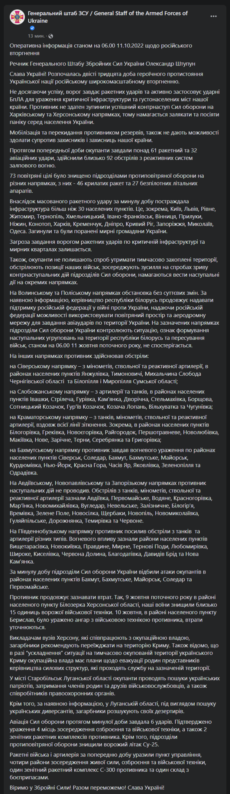 07:10 Сводка украинского Генштаба на утро 11 октября.