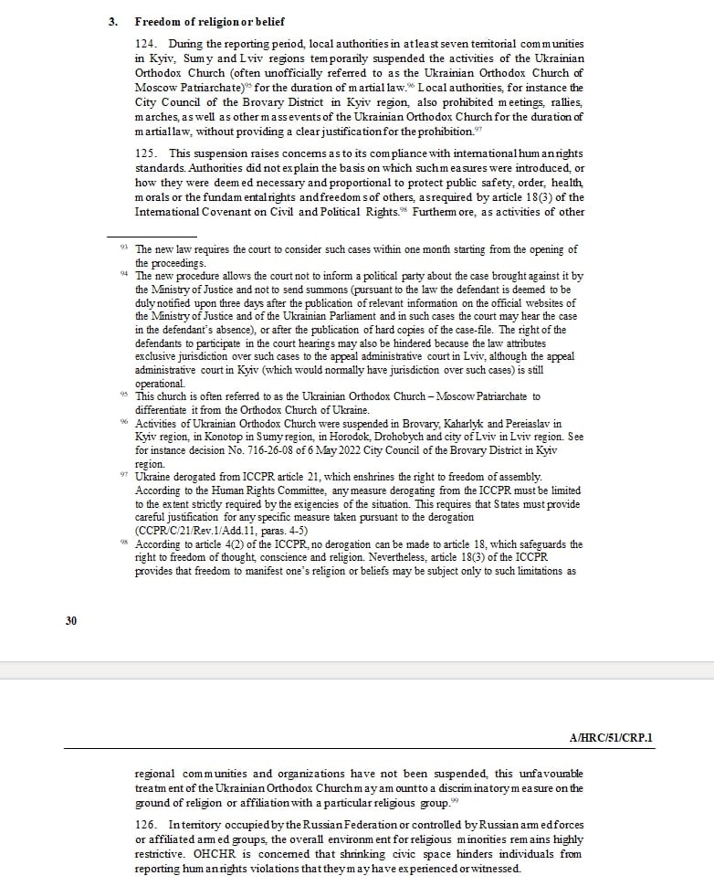 "Местные органы власти по меньшей мере семи территориальных общин в Киевской, Сумской и Львовской областях временно приостановили деятельность УПЦ на время действия военного положения. Например, горсовет Броварского района Киевской области также запретил проведение собраний, митингов, походов и других массовых мероприятий УПЦ на время действия военного положения без предоставления четкого обоснования такого запрета", - говорится в докладе Управления Верховного комиссара ООН по правам человека, который был представлен на 51-й сессии Совета по правам человека ООН