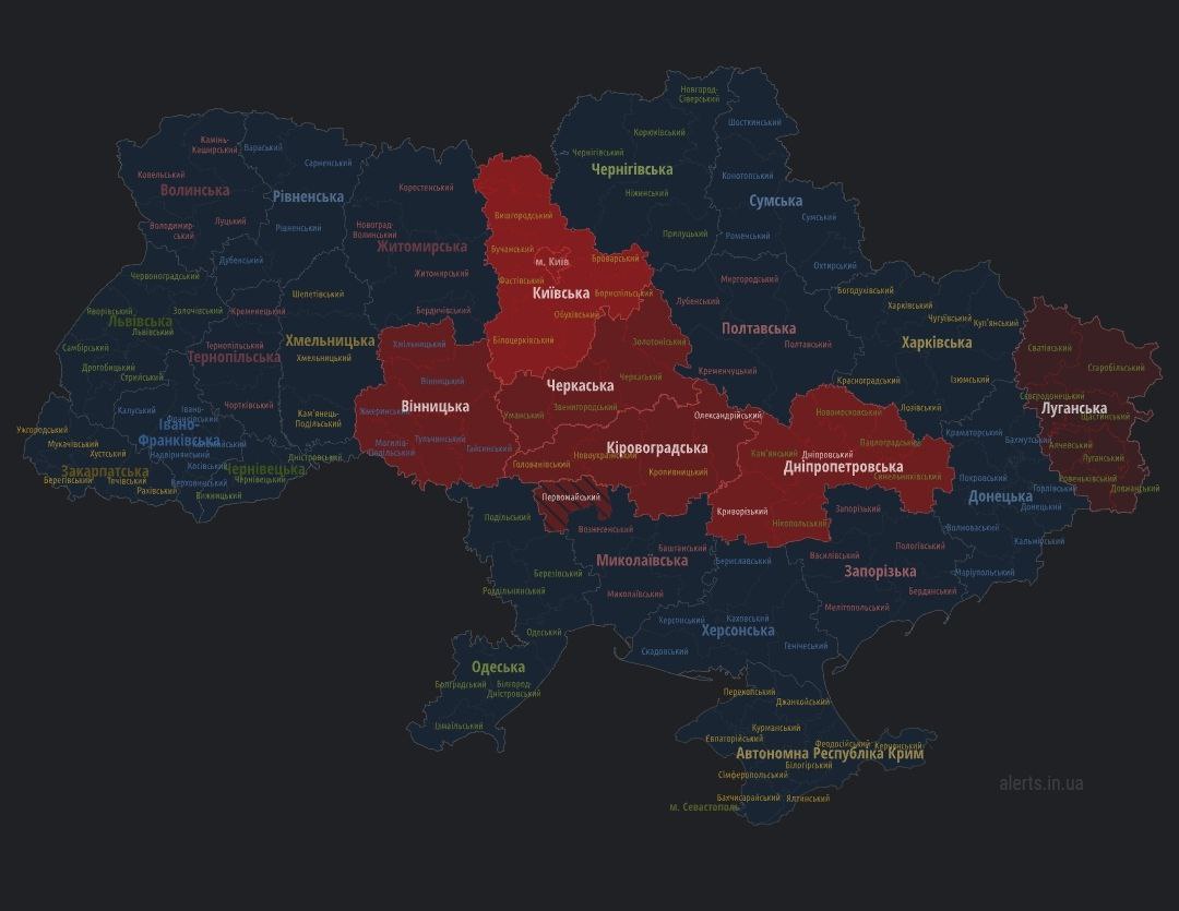06.28 Карта воздушных тревог на сейчас. Под угрозой весь центр и юг.