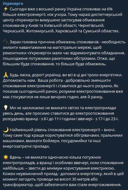 В Укрэнерго заявили, что с 8 утра Украина потребила на 6% больше энергии, чем накануне, поэтому в Киеве и области, а также в Черниговской, Черкасской, Житомирской, Харьковской и Сумской областях вводятся ограничения.