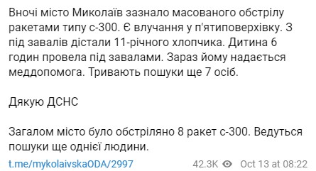 Ким также добавил, что россияне утром выпустили по Николаеву восемь ракет с-300.
