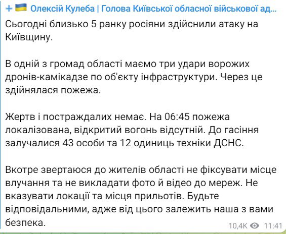 Глава Киевской ОВА Алексей Кулеба подтвердил информацию об ударе трех дронов-камикадзе по области около 5 утра.