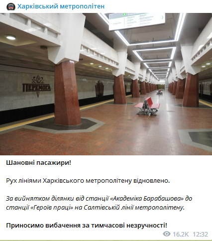 По состоянию на 12:32 нерабочим оставался только участок от станции "Академика Барабашова" до станции "Героев труда" на Салтовской линии метрополитена.